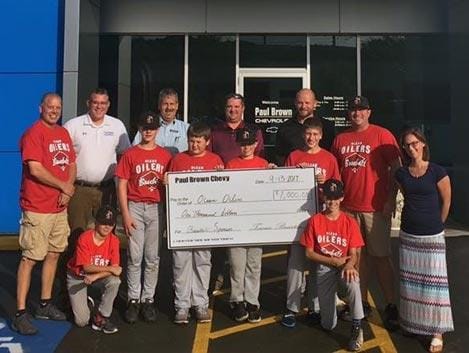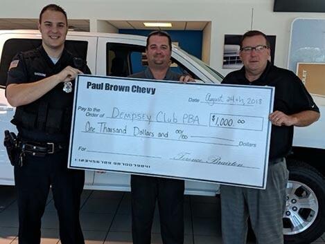 | AUGUST 2018 Paul Brown Cares about the boys in blue! $1000 donation to the Dempsey Club. Pictured are club President Greg Sassone along with Bob Stidd and Rod Pullins from Paul Brown Chevy. |