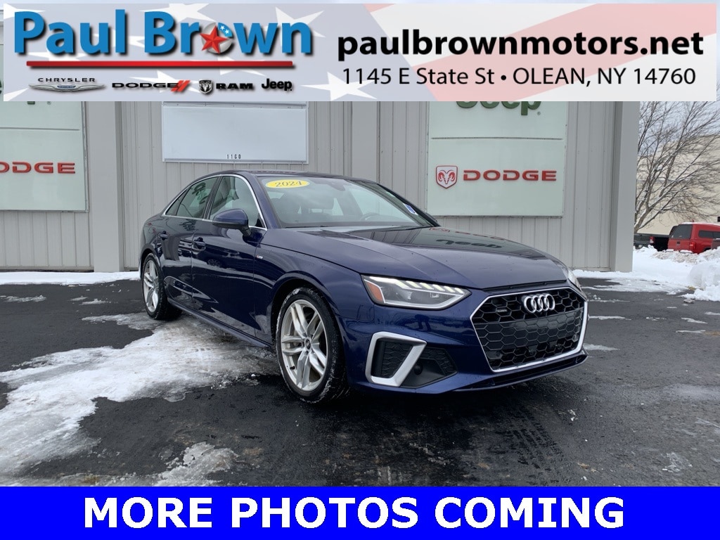 Priced below KBB Fair Purchase Price! CARFAX One-Owner. 2024 Audi A4 45 S line Premium Plus quattro 4D Sedan Navarra Blue Metallic 2.0L 4-Cylinder TFSI quattro 7-Speed Automatic S tronic Balance of new car warranty., 4-Wheel Disc Brakes, ABS brakes, Alloy wheels, Exterior Parking Camera Rear, Front dual zone A/C, Front fog lights, Heated Front Sport Seats, Leather Seating Surfaces, Leather Shift Knob, Leather steering wheel, Power driver seat, Power moonroof, Power passenger seat, Power windows, Rear air conditioning, Remote keyless entry, Speed control, Steering wheel mounted audio controls, Traction control. 24/32 City/Highway MPG Final Price may require vehicle trade in and Paul Brown trade assistance, see website for details. For a hassle free purchase experience, reach out to the Sales team at Paul Brown Chevy at (716) 244-6077. Conveniently located on Route 16 North, Olean NY 14760. We are worth the trip! Travel from over 75 miles away and don't purchase we will supply you with $25 gas card! Paul Brown Chevy, A Dealer For the People! Our For The People Pricing means ZERO price increases at Paul Brown.