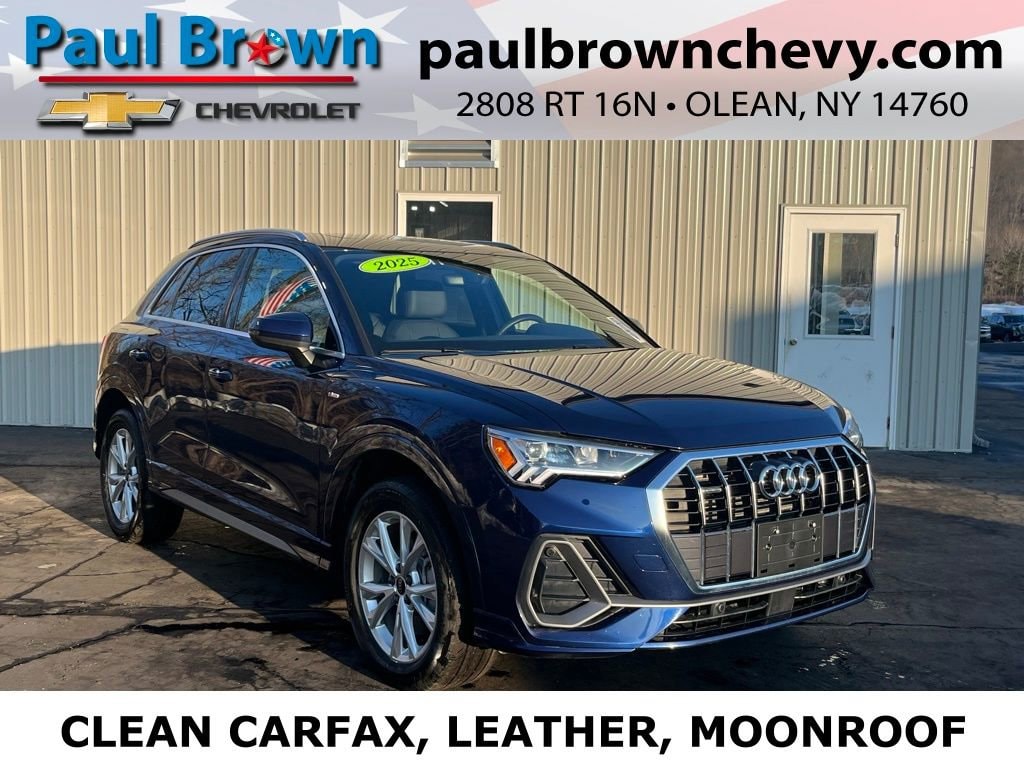 Priced below KBB Fair Purchase Price! CARFAX One-Owner. Clean CARFAX. We monitor over 20,000 websites everyday to ensure our For the People Pricing means you get the best price every time. We want your trade, ask about Paul Brown Trade discount available to all customers with a trade in! 2025 Audi Q3 Premium S Line quattro Odometer is 2606 miles below market average! 4D Sport Utility Navarra Blue Metallic 2.0L 4-Cylinder TFSI 8-Speed Automatic with Tiptronic 20/28 City/Highway MPG quattro Emergency communication system: Audi connect CARE, Front dual zone A/C, Fully automatic headlights, Heated door mirrors, Heated front seats, Leather Seating Surfaces, Low tire pressure warning, Power door mirrors, Power Liftgate, Power passenger seat, Rain sensing wipers, Rear air conditioning, Rear window defroster, Remote keyless entry, Wheels: 18 5-V-Spoke-S Design. For a hassle free purchase experience, reach out to the Sales team at Paul Brown Chevy at (716) 244-6077. Conveniently located on Route 16 North, Olean NY 14760. We are worth the trip! Travel from over 75 miles away and don't purchase we will supply you with $25 gas card! Paul Brown Motors, A Dealer For the People!