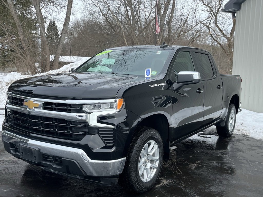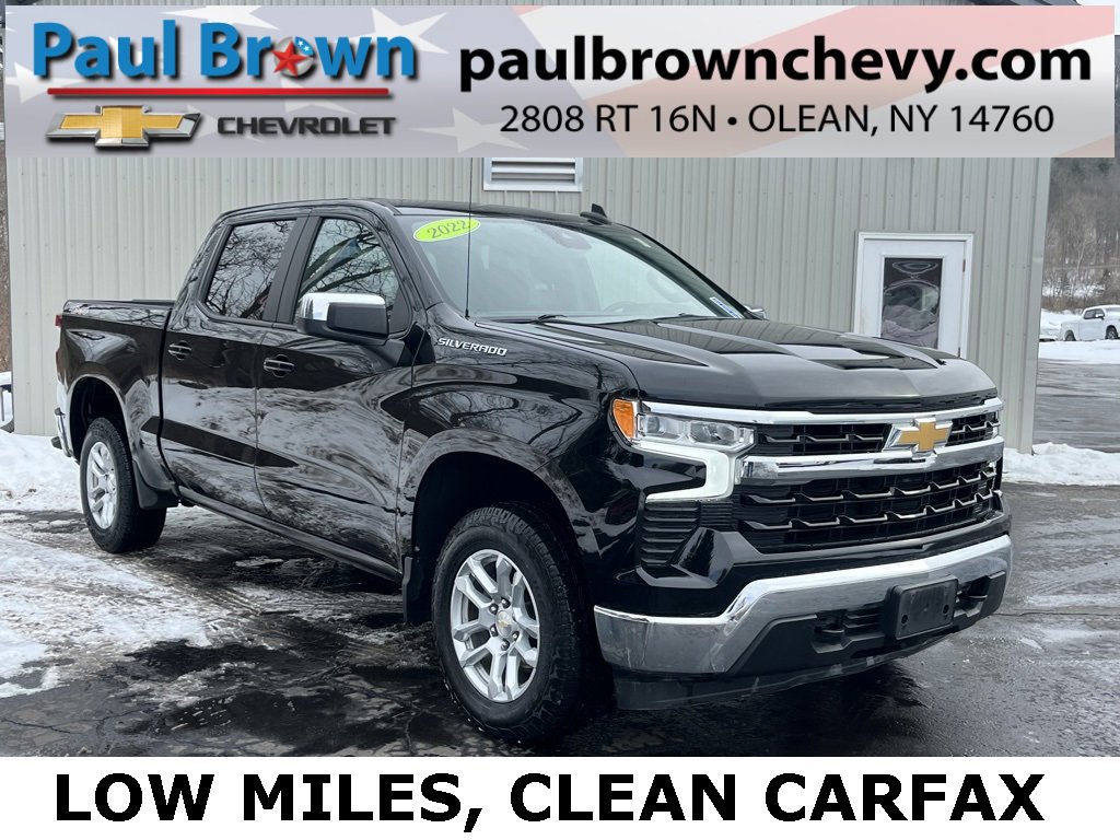 Priced below KBB Fair Purchase Price! Clean CARFAX. 2022 Chevrolet Silverado 1500 LT 4D Crew Cab Black 2.7L Turbo 8-Speed Automatic 4WD 10-Way Power Driver Seat w/Lumbar, 120-Volt Bed Mounted Power Outlet, 120-Volt Instrument Panel Power Outlet, Air Conditioning, Apple CarPlay/Android Auto, Auto-Locking Rear Differential, Chevrolet Connected Access Capable, Cloth Seat Trim, Following Distance Indicator, Forward Collision Alert, Front dual zone A/C, Front Pedestrian Braking, Fully automatic headlights, HD Rear Vision Camera, Heated door mirrors, Heated front seats, Hitch Guidance, Lane Keep Assist w/Lane Departure Warning, Low tire pressure warning, Power door mirrors, Premium audio system: Chevrolet Infotainment 3 Premium, Rear window defroster, SiriusXM w/360L, Trailering Package, Wheels: 18 x 8.5 Bright Silver Painted Aluminum, Wi-Fi Hot Spot Capable. Final Price may require vehicle trade in and Paul Brown trade assistance , see website for details. For a hassle free purchase experience, reach out to the Sales team at Paul Brown Chevy at (716) 244-6077. Conveniently located on Route 16 North, Olean NY 14760. We are worth the trip! Travel from over 75 miles away and don't purchase we will supply you with $25 gas card! Paul Brown Chevy, A Dealer For the People!