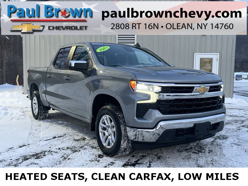 Priced below KBB Fair Purchase Price! CARFAX One-Owner. Clean CARFAX. 2023 Chevrolet Silverado 1500 LT 4D Crew Cab Sterling Gray Metallic 2.7L Turbo 8-Speed Automatic 4WD 10-Way Power Driver Seat w/Lumbar, 12.3 Multicolor Reconfigurable Digital Display, 120-Volt Bed Mounted Power Outlet, 120-Volt Instrument Panel Power Outlet, 6-Speaker Audio System, Apple CarPlay/Android Auto, Automatic Emergency Braking, Bluetooth® For Phone, Chevrolet Connected Access Capable, Cloth Seat Trim, Following Distance Indicator, Forward Collision Alert, Front dual zone A/C, Front Pedestrian Braking, Fully automatic headlights, HD Rear Vision Camera, Heated door mirrors, Heated front seats, Heated steering wheel, Hitch Guidance, Keyless Open & Start, OnStar & Chevrolet Connected Services Capable, Power door mirrors, Premium audio system: Chevrolet Infotainment 3 Premium, Radio: Chevrolet Infotainment 3 Premium System, Rear window defroster, Remote keyless entry, Remote Vehicle Starter System, Trailering Package, Wheels: 18 x 8.5 Bright Silver Painted Aluminum, Wi-Fi Hot Spot Capable, Wireless Phone Projection. Final Price may require vehicle trade in and Paul Brown trade assistance , see website for details. For a hassle free purchase experience, reach out to the Sales team at Paul Brown Chevy at (716) 244-6077. Conveniently located on Route 16 North, Olean NY 14760. We are worth the trip! Travel from over 75 miles away and don't purchase we will supply you with $25 gas card! Paul Brown Chevy, A Dealer For the People!