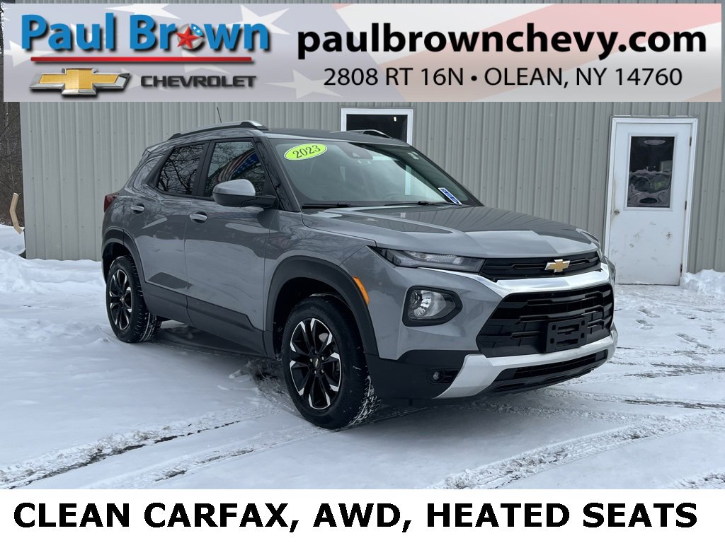 Priced below KBB Fair Purchase Price! CARFAX One-Owner. Clean CARFAX. 2023 Chevrolet TrailBlazer LT 4D Sport Utility Sterling Gray Metallic 1.3L Ecotec Turbo DOHC SIDI w/VVT 9-Speed Automatic AWD 1 Type-A & 1 Type-C USB Charging-Only Ports, 120-Volt Power Outlet, 6-Speaker Audio System Feature w/Amplifier, 7 Diagonal Color Touchscreen, 8-Way Power Driver Seat Adjuster, 8 Diagonal Color Touchscreen Display, Air Conditioning, Cabin Humidity Sensor, Cloth Seat Trim, Emergency communication system: OnStar and Chevrolet connected services capable, Exterior Parking Camera Rear, Fully automatic headlights, Heated door mirrors, Heated front seats, Lane Change Alert w/Side Blind Zone Alert, Low tire pressure warning, Power door mirrors, Radio: Chevrolet Infotainment 3 System, Rear window defroster, SiriusXM Radio, Wheels: 17 High Gloss Black Machined Aluminum, Wireless Apple CarPlay/Android Auto. 26/30 City/Highway MPG Final Price may require vehicle trade in and Paul Brown trade assistance , see website for details. For a hassle free purchase experience, reach out to the Sales team at Paul Brown Chevy at (716) 244-6077. Conveniently located on Route 16 North, Olean NY 14760. We are worth the trip! Travel from over 75 miles away and don't purchase we will supply you with $25 gas card! Paul Brown Chevy, A Dealer For the People!