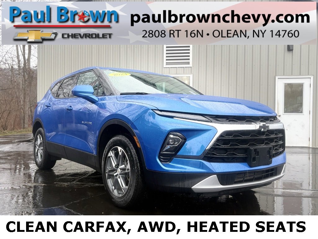 Priced below KBB Fair Purchase Price! CARFAX One-Owner. Clean CARFAX. 2024 Chevrolet Blazer LT 4D Sport Utility Riptide Blue Metallic 2.0L Turbocharged 9-Speed Automatic with Overdrive AWD Odometer is 4434 miles below market average! 6-Speaker Audio System Feature, 8-Way Power Driver Seat Adjuster, Apple CarPlay/Android Auto, Emergency communication system: OnStar and Chevrolet connected services capable, Front dual zone A/C, Fully automatic headlights, Heated door mirrors, Heated front seats, Lane Change Alert w/Side Blind Zone Alert, Low tire pressure warning, Power door mirrors, Power Driver Lumbar Control, Premium audio system: Chevrolet Infotainment 3 Plus, Radio: Chevrolet Infotainment 3 Plus System, Rear Cross Traffic Alert, Rear Park Assist w/Audible Warning, Rear window defroster, Ride & Handling Suspension, SiriusXM w/360L, Wheels: 18 Grazen Metallic Aluminum. 22/27 City/Highway MPG Final Price may require vehicle trade in and Paul Brown trade assistance , see website for details. For a hassle free purchase experience, reach out to the Sales team at Paul Brown Chevy at (716) 244-6077. Conveniently located on Route 16 North, Olean NY 14760. We are worth the trip! Travel from over 75 miles away and don't purchase we will supply you with $25 gas card! Paul Brown Chevy, A Dealer For the People!