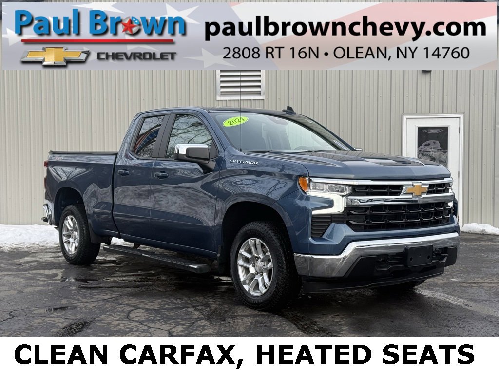 Priced below KBB Fair Purchase Price! CARFAX One-Owner. Clean CARFAX. 2024 Chevrolet Silverado 1500 LT 4D Extended Cab Lakeshore Blue Metallic 2.7L I4 Turbocharged DOHC 16V LEV3-SULEV30 310hp 8-Speed Automatic 4WD Odometer is 1383 miles below market average! 12.3 Multicolor Reconfigurable Digital Display, 120-Volt Bed Mounted Power Outlet, 120-Volt Interior Power Outlet, Auto-Locking Rear Differential, Automatic Emergency Braking, Bluetooth® For Phone, Chevrolet Connected Access Capable, Cloth Seat Trim, Dual Rear USB Ports (Charge Only), Following Distance Indicator, Forward Collision Alert, Front dual zone A/C, Front Pedestrian Braking, Fully automatic headlights, Heated door mirrors, Heated Steering Wheel, Hitch Guidance, Lane Keep Assist w/Lane Departure Warning, Low tire pressure warning, OnStar & Chevrolet Connected Services Capable, Power door mirrors, Rear window defroster, Remote keyless entry, Remote Vehicle Starter System, SiriusXM w/360L, Trailering Package, Wheels: 18 x 8.5 Bright Silver Painted Aluminum, Wi-Fi Hot Spot Capable. Final Price may require vehicle trade in and Paul Brown trade assistance , see website for details. For a hassle free purchase experience, reach out to the Sales team at Paul Brown Chevy at (716) 244-6077. Conveniently located on Route 16 North, Olean NY 14760. We are worth the trip! Travel from over 75 miles away and don't purchase we will supply you with $25 gas card! Paul Brown Chevy, A Dealer For the People!