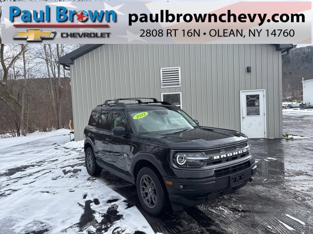 Priced below KBB Fair Purchase Price! CARFAX One-Owner. 2022 Ford Bronco Sport Big Bend 4D Sport Utility Shadow Black 1.5L EcoBoost 8-Speed Automatic 4WD Air Conditioning, Automatic temperature control, Emergency communication system: SYNC 3 911 Assist, Fully automatic headlights, Heated door mirrors, Heated Front Bucket Seats, Low tire pressure warning, Power door mirrors, Rear Parking Sensors, Rear window defroster, Remote keyless entry, SYNC 3 Communications & Entertainment System, Unique Cloth Front Bucket Seats. 25/28 City/Highway MPG Final Price may require vehicle trade in and Paul Brown trade assistance , see website for details. For a hassle free purchase experience, reach out to the Sales team at Paul Brown Chevy at (716) 244-6077. Conveniently located on Route 16 North, Olean NY 14760. We are worth the trip! Travel from over 75 miles away and don't purchase we will supply you with $25 gas card! Paul Brown Chevy, A Dealer For the People!