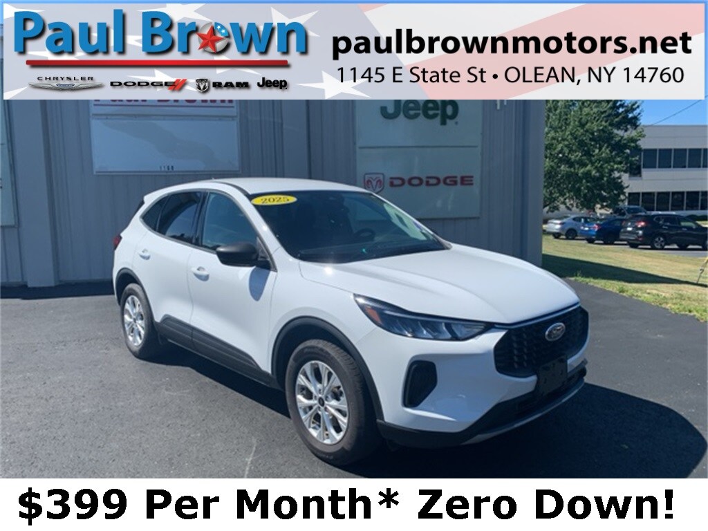 Priced below KBB Fair Purchase Price! CARFAX One-Owner. Clean CARFAX. 2025 Ford Escape Active 4D Sport Utility Oxford White 1.5L EcoBoost AWD 8-Speed Automatic Balance of new car warranty., *$399 per month /Zero cash or trade down / tax not included / 84 months and must qualify for top tier APR, ABS brakes, Auto High-beam Headlights, Emergency communication system: SYNC 4 911 Assist, Equipment Group 200A, Front dual zone A/C, Fully automatic headlights, Low tire pressure warning, Power door mirrors, Power windows, Rear window defroster, Remote keyless entry, Speed control, SYNC 4, Telescoping steering wheel, Traction control, Wheels: 17" Shadow Silver-Painted Aluminum. 26/32 City/Highway MPG Final Price may require vehicle trade in and Paul Brown trade assistance, see website for details. For a hassle free purchase experience, reach out to the Sales team at Paul Brown Chevy at (716) 244-6077. Conveniently located on Route 16 North, Olean NY 14760. We are worth the trip! Travel from over 75 miles away and don't purchase we will supply you with $25 gas card! Paul Brown Chevy, A Dealer For the People! Our For The People Pricing means ZERO price increases at Paul Brown.