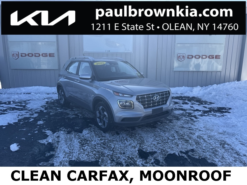 Priced below KBB Fair Purchase Price! CARFAX One-Owner. Clean CARFAX. 2025 Hyundai Venue SEL 4D Sport Utility Shimmering Silver I4 FWD CVT Balance of new car warranty., 6.5J x 17" Alloy Wheels, Air Conditioning, Apple CarPlay & Android Auto, Automatic temperature control, Cloth Seat Trim, Fully automatic headlights, Low tire pressure warning, Power door mirrors, Power moonroof, Power windows, Remote keyless entry, Speed control, Traction control. 29/32 City/Highway MPG Final Price may require vehicle trade in and Paul Brown trade assistance, see website for details. For a hassle free purchase experience, reach out to the Sales team at Paul Brown Motors at (585-376-5057). Conveniently located on E State Street, Olean NY 14760. We are worth the trip! Travel from over 75 miles away and don't purchase we will supply you with $25 gas card! Paul Brown Chevy, A Dealer For the People! Our For The People Pricing means ZERO price increases at Paul Brown.