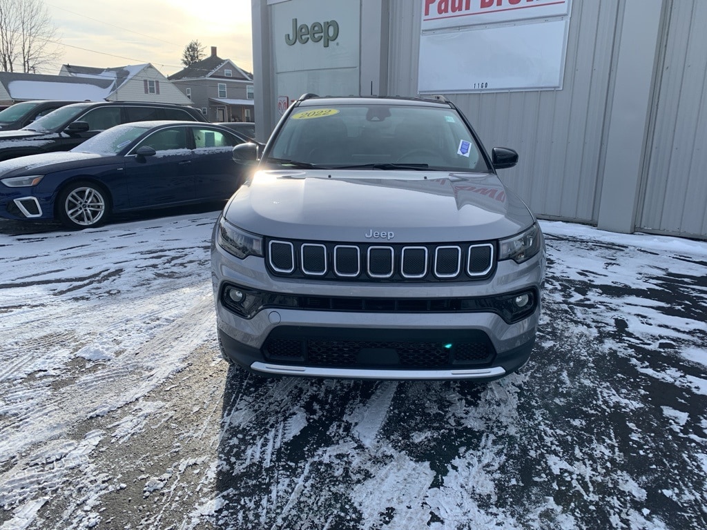 Priced below KBB Fair Purchase Price! Clean CARFAX. 2022 Jeep Compass Limited 4D Sport Utility Billet Silver Metallic Clearcoat Odometer is 1147 miles below market average! 2.4L I4 4WD 9-Speed 948TE Automatic Balance of new car warranty., Emergency communication system: SiriusXM Guardian, Front dual zone A/C, Front fog lights, Fully automatic headlights, Heated door mirrors, Heated front seats, Heated steering wheel, Leather Trimmed Bucket Seats, Low tire pressure warning, ParkView Rear Back-Up Camera, Power door mirrors, Power driver seat, Power windows, Rear window defroster, Remote keyless entry, Wheels: 18" x 7" Painted Diamond Cut Aluminum. 22/30 City/Highway MPG Final Price may require vehicle trade in and Paul Brown trade assistance, see website for details. For a hassle free purchase experience, reach out to the Sales team at Paul Brown Chevy at (716) 244-6077. Conveniently located on Route 16 North, Olean NY 14760. We are worth the trip! Travel from over 75 miles away and don't purchase we will supply you with $25 gas card! Paul Brown Chevy, A Dealer For the People! Our For The People Pricing means ZERO price increases at Paul Brown.