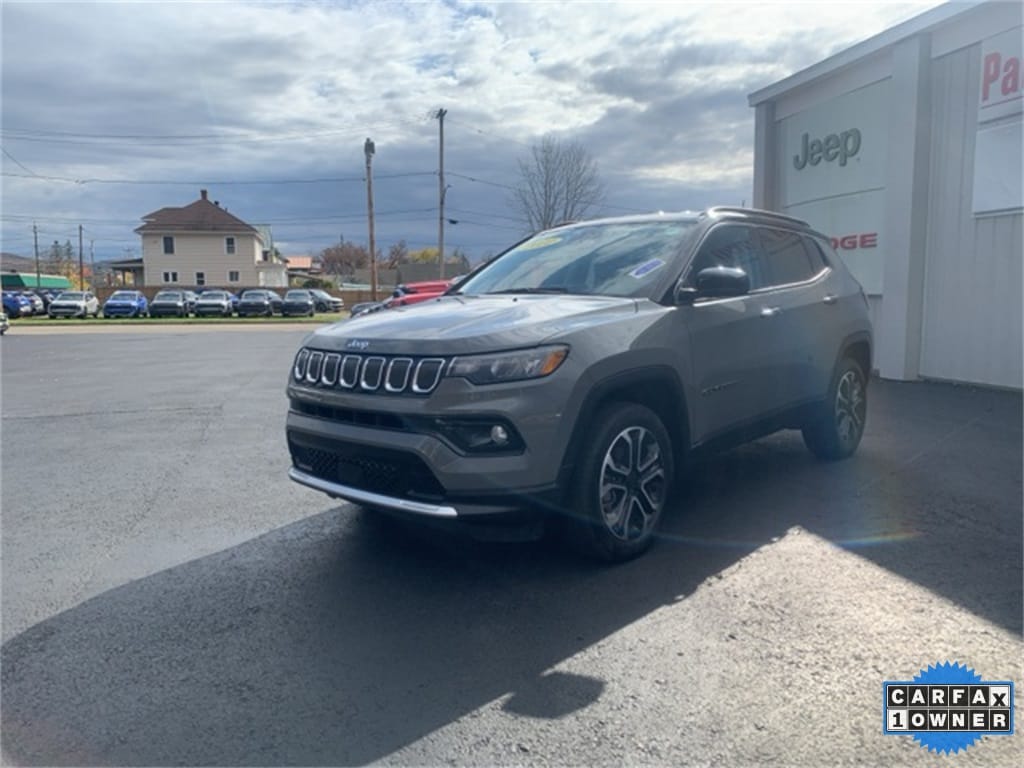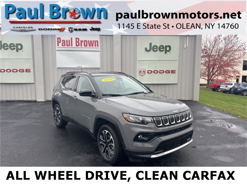 Priced below KBB Fair Purchase Price! Clean CARFAX. 2022 Jeep Compass Limited 4D Sport Utility Sting-Gray Clearcoat Odometer is 4017 miles below market average! 2.4L I4 4WD 9-Speed 948TE Automatic *$355 per month /Zero cash or trade down / tax not included / 84 months and must qualify for top tier APR, Emergency communication system: SiriusXM Guardian, Front dual zone A/C, Fully automatic headlights, Heated door mirrors, Heated front seats, Heated steering wheel, Leather Trimmed Bucket Seats, Low tire pressure warning, Power door mirrors, Power driver seat, Rain sensing wipers, Rear window defroster, Remote keyless entry, Wheels: 18" x 7" Painted Diamond Cut Aluminum. 22/30 City/Highway MPG Final Price may require vehicle trade in and Paul Brown trade assistance, see website for details. For a hassle free purchase experience, reach out to the Sales team at Paul Brown Chevy at (716) 244-6077. Conveniently located on Route 16 North, Olean NY 14760. We are worth the trip! Travel from over 75 miles away and don't purchase we will supply you with $25 gas card! Paul Brown Chevy, A Dealer For the People! Our For The People Pricing means ZERO price increases at Paul Brown.