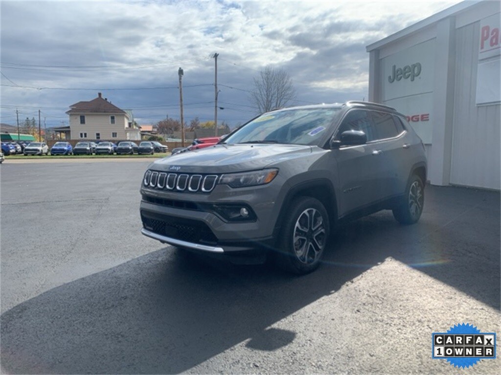 Priced below KBB Fair Purchase Price! CARFAX One-Owner. Clean CARFAX. 2022 Jeep Compass Limited 4D Sport Utility Sting-Gray Clearcoat Odometer is 8964 miles below market average! 2.4L I4 4WD 9-Speed 948TE Automatic *$355 per month /Zero cash or trade down / tax not included / 84 months and must qualify for top tier APR, Emergency communication system: SiriusXM Guardian, Front dual zone A/C, Fully automatic headlights, Heated door mirrors, Heated front seats, Heated steering wheel, Leather Trimmed Bucket Seats, Low tire pressure warning, Power door mirrors, Power driver seat, Rain sensing wipers, Rear window defroster, Remote keyless entry, Wheels: 18" x 7" Painted Diamond Cut Aluminum. 22/30 City/Highway MPG Final Price may require vehicle trade in and Paul Brown trade assistance, see website for details. For a hassle free purchase experience, reach out to the Sales team at Paul Brown Chevy at (716) 244-6077. Conveniently located on Route 16 North, Olean NY 14760. We are worth the trip! Travel from over 75 miles away and don't purchase we will supply you with $25 gas card! Paul Brown Chevy, A Dealer For the People! Our For The People Pricing means ZERO price increases at Paul Brown.