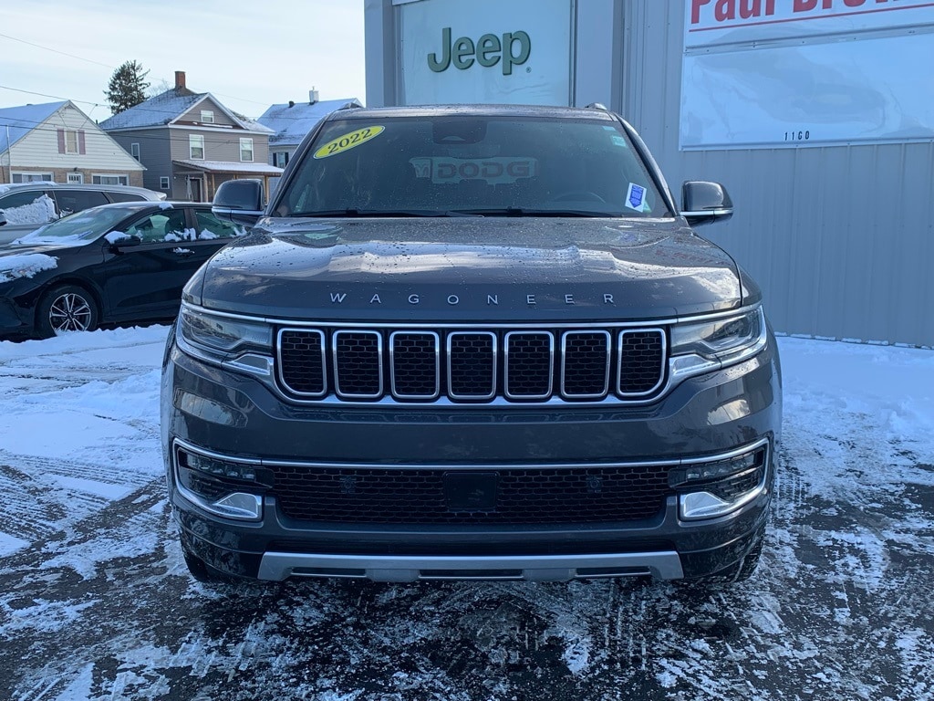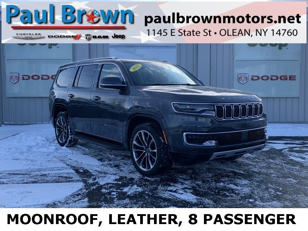 Priced below KBB Fair Purchase Price! CARFAX One-Owner. 2022 Jeep Wagoneer Series II 4D Sport Utility Baltic Gray Metallic Clearcoat Odometer is 13196 miles below market average! 5.7L V8 4WD 8-Speed Automatic 10 Speakers, 3 Panel Sunroof, ABS brakes, Adjustable pedals, Adjustable Roof Rail Crossbars, Auto-leveling suspension, Automatic temperature control, Cargo Cover, Exterior Parking Camera Rear, Front dual zone A/C, Front fog lights, Heated door mirrors, Heated front seats, Heated steering wheel, Leather Trimmed Bucket Seats, Low tire pressure warning, Memory seat, Navigation System/GPS/Navi, Pedal memory, Power door mirrors, Power driver seat, Power Liftgate, Power passenger seat, Premium Group I (DISC), Rain sensing wipers, Rear dual zone A/C, Remote keyless entry, Telescoping steering wheel, Tilt steering wheel, Ventilated front seats, Wheels: 22" x 9.0" Premium 3 Aluminum (DISC). Final Price may require vehicle trade in and Paul Brown trade assistance, see website for details. For a hassle free purchase experience, reach out to the Sales team at Paul Brown Motors at (585-376-5057). Conveniently located on E State Street, Olean NY 14760. We are worth the trip! Travel from over 75 miles away and don't purchase we will supply you with $25 gas card! Paul Brown Chevy, A Dealer For the People! Our For The People Pricing means ZERO price increases at Paul Brown.