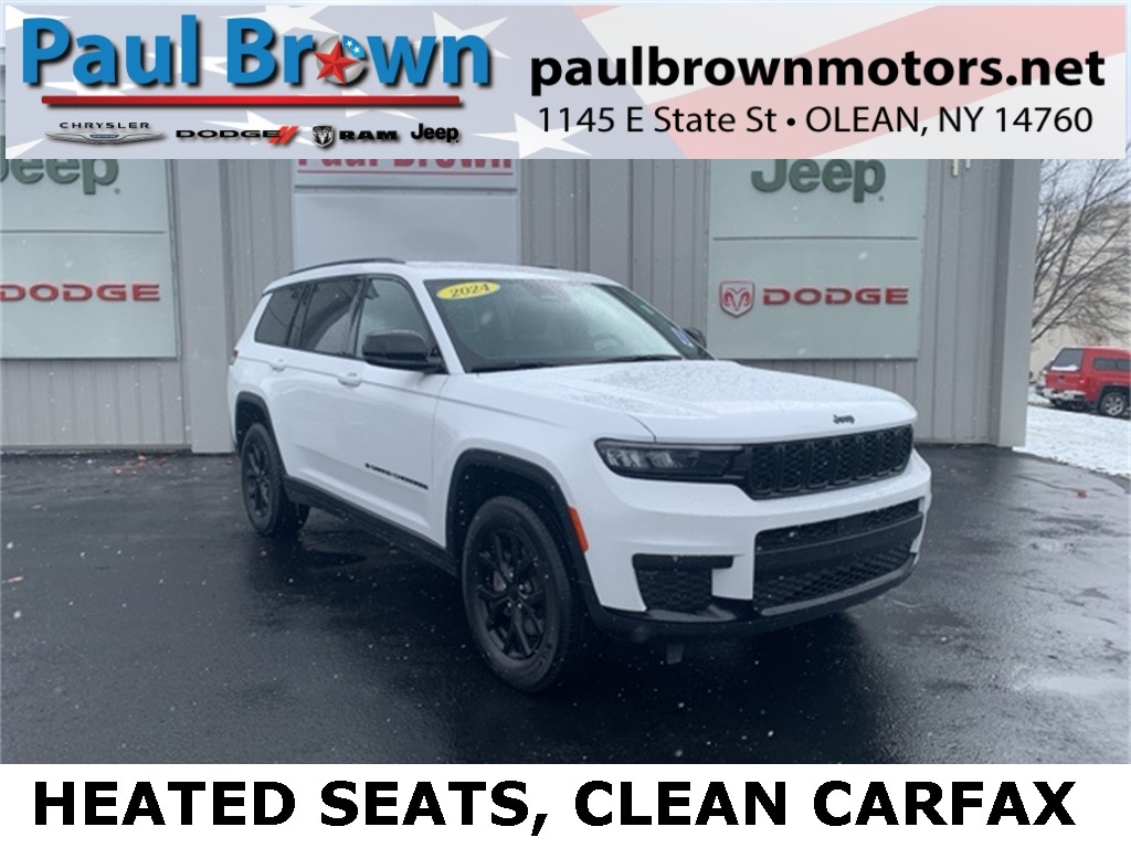 CARFAX One-Owner. Clean CARFAX. 2024 Jeep Grand Cherokee L Altitude 4D Sport Utility Bright White Clearcoat 3.6L V6 24V VVT 4WD 8-Speed Automatic 115V Auxiliary Power Outlet, 3rd Row Charge-Only USB Ports, Altitude Appearance Package, Capri Leatherette/Suede Seats, Front dual zone A/C, Fully automatic headlights, Heated door mirrors, Heated Front Seats, Heated Steering Wheel, Low tire pressure warning, ParkView Rear Back-Up Camera, Power door mirrors, Power driver seat, Power Liftgate, Rain Sensitive Windshield Wipers, Rear air conditioning, Rear window defroster, Remote keyless entry, Wheels: 18" x 8.0" Fully Painted Aluminum, Wireless Charging Pad. Final Price may require vehicle trade in and Paul Brown trade assistance, see website for details. For a hassle free purchase experience, reach out to the Sales team at Paul Brown Chevy at (716) 244-6077. Conveniently located on Route 16 North, Olean NY 14760. We are worth the trip! Travel from over 75 miles away and don't purchase we will supply you with $25 gas card! Paul Brown Chevy, A Dealer For the People! Our For The People Pricing means ZERO price increases at Paul Brown.