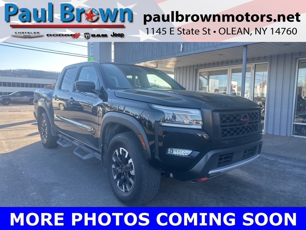 CARFAX One-Owner. Clean CARFAX. 2023 Nissan Frontier PRO-4X 4D Crew Cab Super Black 3.8L DI DOHC 24V V6 4WD 9-Speed Automatic Balance of new car warranty., 120V Power Outlet in Bed, 120V Power Outlet in Rear Center Console, Alloy wheels, Automatic temperature control, Bed Under-Rail Lighting, Front dual zone A/C, Front fog lights, Heated Front Seats, Heated Outside Mirrors, Heated Steering Wheel, Intelligent Around View Monitor (I-AVM), Navigation system: Nissan Navigation with Voice Recognition, Off-Road Protection Package, Power driver seat, Power windows, PRO Convenience Package, PRO-4X Mud Flaps, Remote Engine Starter, Speed control, Spray-In Bedliner, Tilt steering wheel, Tow Package: Hitch, Tow Harness, Trailer Hitch w/Wiring Harness, Utili-Track System, Wireless Charging For Personal Devices. Final Price may require vehicle trade in and Paul Brown trade assistance, see website for details. For a hassle free purchase experience, reach out to the Sales team at Paul Brown Motors at (585-376-5057). Conveniently located on E State Street, Olean NY 14760. We are worth the trip! Travel from over 75 miles away and don't purchase we will supply you with $25 gas card! Paul Brown Chevy, A Dealer For the People! Our For The People Pricing means ZERO price increases at Paul Brown.
