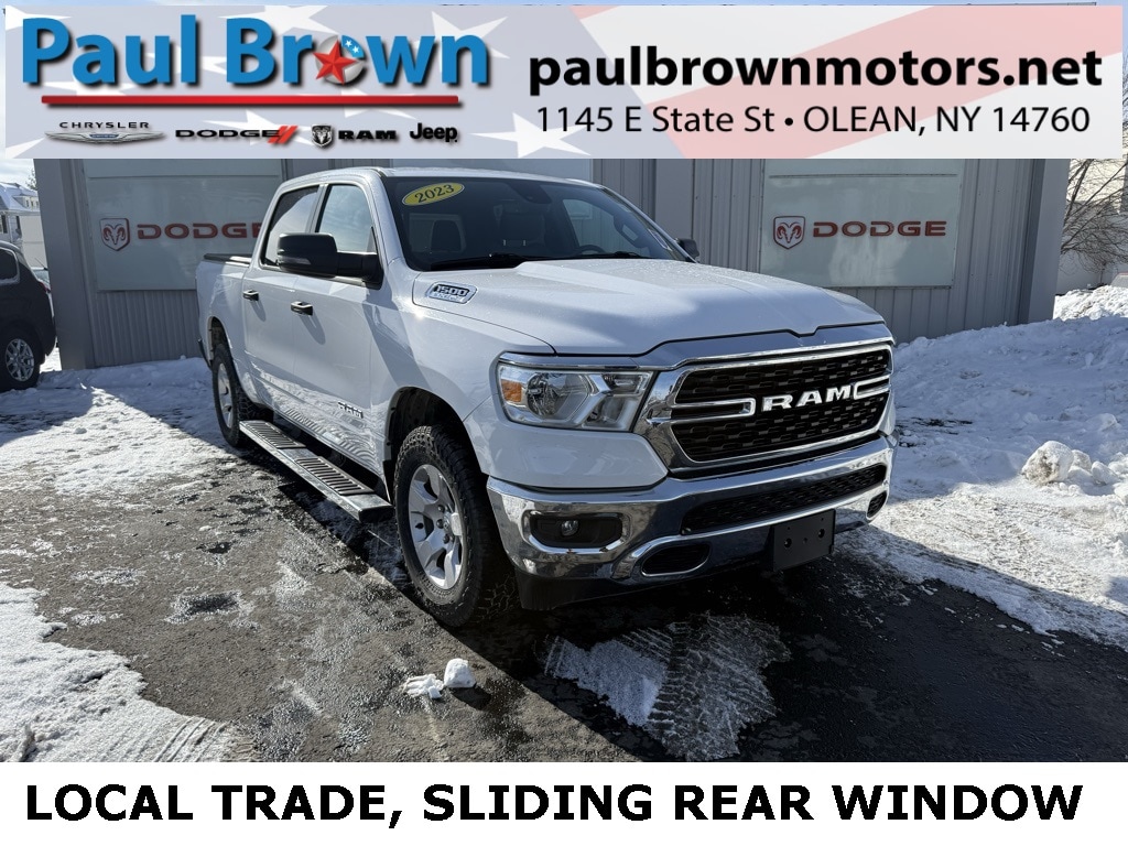 Priced below KBB Fair Purchase Price! CARFAX One-Owner. 2023 Ram 1500 Big Horn/Lone Star 4D Crew Cab Bright White Clearcoat 3.6L V6 24V VVT 4WD 8-Speed Automatic Local Trade, Sold and serviced right here at Paul Brown., 2nd Row In Floor Storage Bins, 4G LTE Wi-Fi Hot Spot, 8.4" Touchscreen Display, Air Conditioning, Apple CarPlay, Auto-Dimming Exterior Driver Mirror, Auto-Dimming Rear-View Mirror, Big Horn Level 1 Equipment Group, Black Exterior Mirrors, Black Premium Power Mirrors, Bluetooth Handsfree Phone & Audio, Class IV Receiver Hitch, Convex Wide-Angle Exterior Mirror Insert, Electric Shift-On-Demand Transfer Case, Emergency communication system: SiriusXM Guardian, Exterior Mirrors Courtesy Lamps, Exterior Mirrors w/Heating Element, Exterior Mirrors w/Supplemental Signals, Front Fog Lamps, Google Android Auto, Heated Front Seats, Heated Steering Wheel, Low tire pressure warning, ParkView Rear Back-Up Camera, Power windows, Power-Folding Mirrors, Radio: Uconnect 5 W w/8.4" Display, Rear Power Sliding Window, Rear Window Defroster, SiriusXM Satellite Radio, Speed control, USB Host Flip, Wheels: 18" x 8" Cast-Aluminum Painted. Final Price may require vehicle trade in and Paul Brown trade assistance, see website for details. For a hassle free purchase experience, reach out to the Sales team at Paul Brown Motors at (585-376-5057). Conveniently located on E State Street, Olean NY 14760. We are worth the trip! Travel from over 75 miles away and don't purchase we will supply you with $25 gas card! Paul Brown Chevy, A Dealer For the People! Our For The People Pricing means ZERO price increases at Paul Brown.