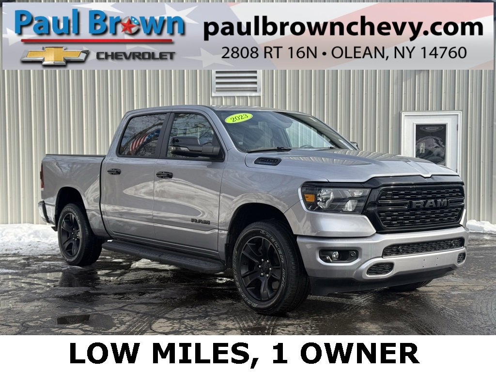 CARFAX One-Owner. 2023 Ram 1500 Big Horn/Lone Star 4D Crew Cab Billet Silver Metallic Clearcoat 3.6L V6 24V VVT 8-Speed Automatic 4WD 115V Auxiliary Power Outlet, 2nd Row In Floor Storage Bins, 400W Inverter, 9 Amplified Speakers w/Subwoofer, Accent Color Door Handles, Accent Color Premium Power Mirrors, Air Conditioning ATC w/Dual Zone Control, Anti-Spin Differential Rear Axle, Auto-Dimming Exterior Driver Mirror, Auto-Dimming Rear-View Mirror, Big Horn Level B Equipment Group, Black Exterior Mirrors, Black Exterior Truck Badging, Black Headlamp Bezels, Black Interior Accents, Black Painted Exterior Mirrors Caps, Black Premium Power Mirrors, Body Color Front Bumper, Body Color Rear Bumper w/Step Pads, Class IV Receiver Hitch, Cluster 7.0 TFT Color Display, Convex Wide-Angle Exterior Mirror Insert, Deluxe Cloth Bucket Seats, Dual Exhaust w/Black Tips, Exterior Mirrors Courtesy Lamps, Exterior Mirrors w/Heating Element, Exterior Mirrors w/Supplemental Signals, Front Fog Lamps, Global Telematics Box Module (TBM), Glove Box Lamp, Heated Front Seats, Heated Steering Wheel, LED Footwell Lighting, Media Hub w/2 Charge Only USBs, Night Edition, ParkSense Front/Rear Park Assist w/Stop, Power 2-Way Driver Lumbar Adjust, Power 8-Way Driver Seat, Power Adjustable Pedals, Power-Folding Mirrors, Radio: Uconnect 5 Nav w/12.0 Display, RAM Grille Badge - Black, Rear Dome w/On/Off Switch Lamp, Rear Power Sliding Window, Rear Window Defroster, Remote Start System, Security Alarm, SiriusXM Radio Service, SiriusXM Satellite Radio, Sun Visors w/Illuminated Vanity Mirrors, Universal Garage Door Opener, Wheels: 20 x 9.0 Premium Paint/Polished. Final Price may require vehicle trade in and Paul Brown trade assistance , see website for details. For a hassle free purchase experience, reach out to the Sales team at Paul Brown Chevy at (716) 244-6077. Conveniently located on Route 16 North, Olean NY 14760. We are worth the trip! Travel from over 75 miles away and don't purchase we will supply you with $25 gas card! Paul Brown Chevy, A Dealer For the People!
