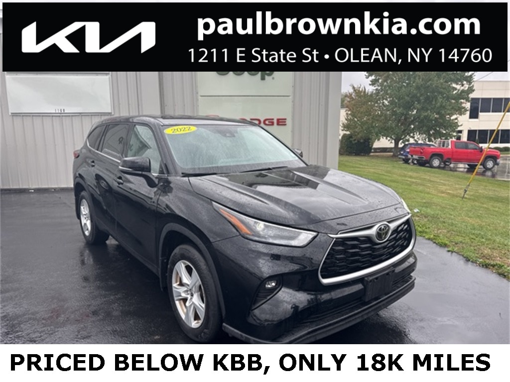 Priced below KBB Fair Purchase Price! CARFAX One-Owner. 2022 Toyota Highlander LE 4D Sport Utility Midnight Black Metallic Odometer is 16306 miles below market average! 3.5L V6 DOHC AWD 8-Speed Automatic 18" Painted Alloy Wheels, Apple CarPlay/Android Auto, Emergency communication system: Safety Connect with 1-year trial, Exterior Parking Camera Rear, Front dual zone A/C, Fully automatic headlights, Heated door mirrors, Low tire pressure warning, Power door mirrors, Power driver seat, Power Liftgate, Rear air conditioning, Rear window defroster. 20/27 City/Highway MPG Final Price may require vehicle trade in and Paul Brown trade assistance , see website for details. For a hassle free purchase experience, reach out to the Sales team at Paul Brown Chevy at (716) 244-6077. Conveniently located on Route 16 North, Olean NY 14760. We are worth the trip! Travel from over 75 miles away and don't purchase we will supply you with $25 gas card! Paul Brown Chevy, A Dealer For the People! Our For The People Pricing means ZERO price increases at Paul Brown.