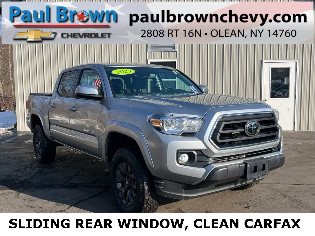 CARFAX One-Owner. Clean CARFAX. 2023 Toyota Tacoma SR5 V6 4D Double Cab Celestial Silver Metallic 3.5L V6 6-Speed 4WD ABS brakes, Active Cruise Control, Alloy wheels, Apple CarPlay/Android Auto, Automatic temperature control, Electronic Stability Control, Emergency communication system: Safety Connect (1-year trial), Fabric Seat Trim, Front Door Smart Key System w/Push Button Start, Front dual zone A/C, Heated door mirrors, Illuminated entry, Low tire pressure warning, Power door mirrors, Power Sliding Rear Window w/Privacy Glass, Remote keyless entry, Traction control. Final Price may require vehicle trade in and Paul Brown trade assistance , see website for details. For a hassle free purchase experience, reach out to the Sales team at Paul Brown Chevy at (716) 244-6077. Conveniently located on Route 16 North, Olean NY 14760. We are worth the trip! Travel from over 75 miles away and don't purchase we will supply you with $25 gas card! Paul Brown Chevy, A Dealer For the People!