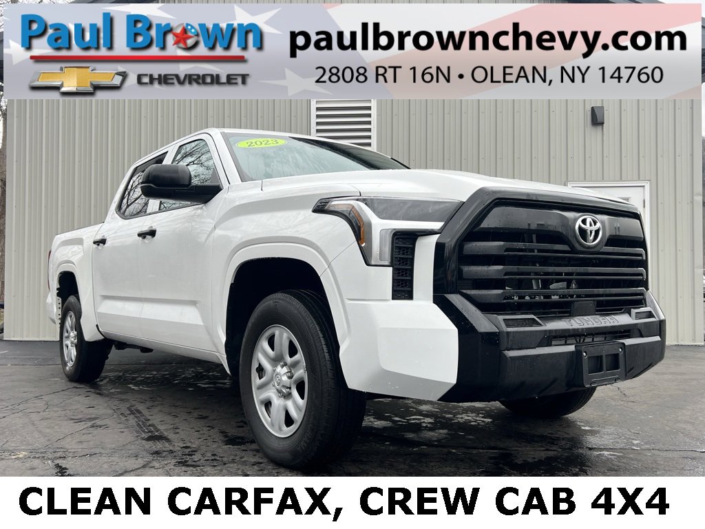 Priced below KBB Fair Purchase Price! CARFAX One-Owner. 2023 Toyota Tundra SR 4D CrewMax Ice Cap 3.4L V6 10-Speed Automatic 4WD 18 Styled Steel Wheels, Air Conditioning, Automatic temperature control, Emergency communication system: Safety Connect (10-year trial), Exterior Parking Camera Rear, Fabric Seat Trim, Fully automatic headlights, Heated door mirrors, Low tire pressure warning, Power door mirrors, Rear window defroster, Remote keyless entry. Final Price may require vehicle trade in and Paul Brown trade assistance , see website for details. For a hassle free purchase experience, reach out to the Sales team at Paul Brown Chevy at (716) 244-6077. Conveniently located on Route 16 North, Olean NY 14760. We are worth the trip! Travel from over 75 miles away and don't purchase we will supply you with $25 gas card! Paul Brown Chevy, A Dealer For the People!