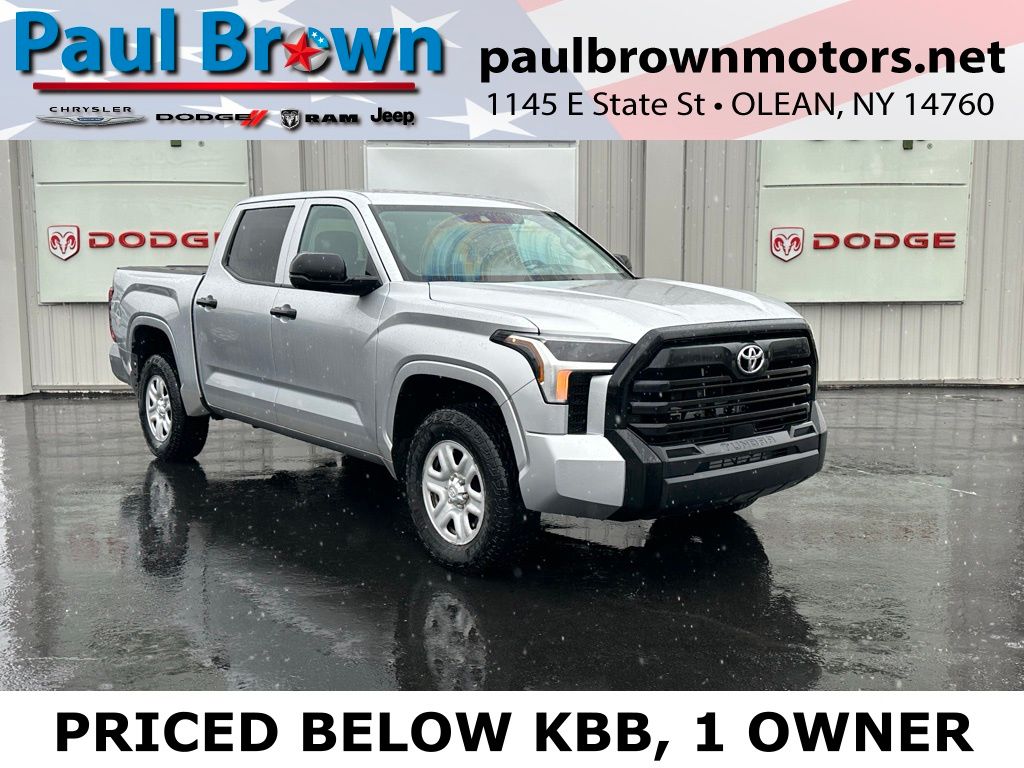 Priced below KBB Fair Purchase Price! CARFAX One-Owner. 2023 Toyota Tundra SR 4D CrewMax Celestial Silver Metallic Odometer is 14935 miles below market average! 3.4L V6 4WD 10-Speed Automatic Balance of new car warranty., 18" Styled Steel Wheels, Air Conditioning, Apple CarPlay/Android Auto, Automatic temperature control, Emergency communication system: Safety Connect (10-year trial), Exterior Parking Camera Rear, Fabric Seat Trim, Fully automatic headlights, Heated door mirrors, Low tire pressure warning, Power door mirrors, Power windows, Remote keyless entry, Speed control. Final Price may require vehicle trade in and Paul Brown trade assistance, see website for details. For a hassle free purchase experience, reach out to the Sales team at Paul Brown Motors at (585-376-5057). Conveniently located on E State Street, Olean NY 14760. We are worth the trip! Travel from over 75 miles away and don't purchase we will supply you with $25 gas card! Paul Brown Chevy, A Dealer For the People! Our For The People Pricing means ZERO price increases at Paul Brown.