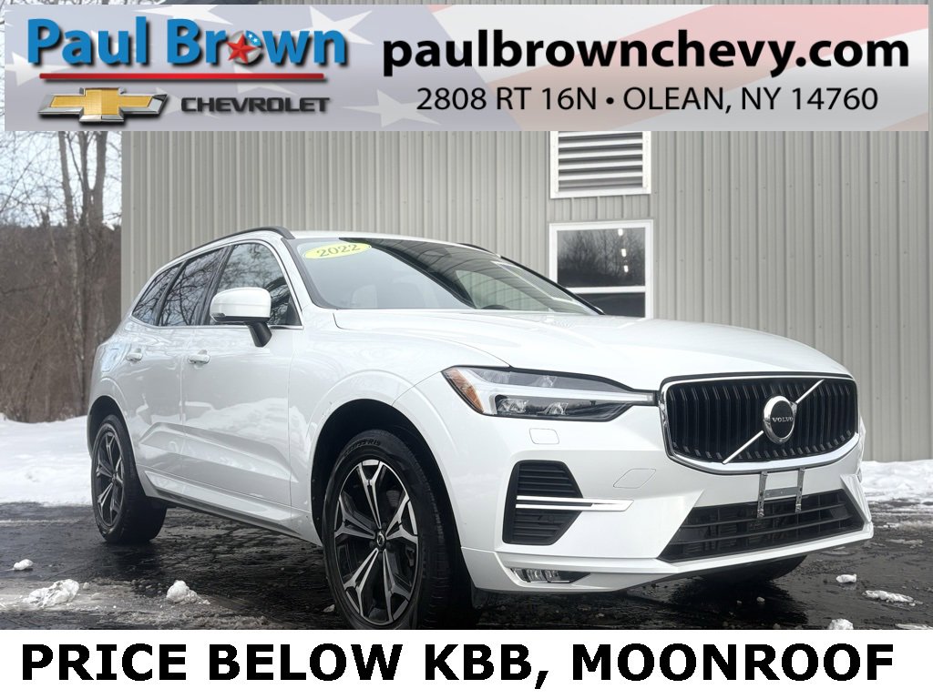 Priced below KBB Fair Purchase Price! CARFAX One-Owner. 2022 Volvo XC60 B5 Momentum 4D Sport Utility Crystal White 2.0L I4 Turbocharged Automatic with Geartronic AWD Odometer is 22530 miles below market average! 10 Speakers, Climate Package, Emergency communication system: Volvo Cars App w/4 Year Subscription, Exterior Parking Camera Rear, Front dual zone A/C, Fully automatic headlights, Headlight High Pressure Cleaning, Heated door mirrors, Heated front seats, Heated Rear Seats, Heated Steering Wheel, Low tire pressure warning, Memory seat, Power door mirrors, Power driver seat, Power moonroof, Power Operated Tailgate, Power passenger seat, Rain sensing wipers, Rear window defroster, Wheels: 19 5-Y Spoke Black Diamond Cut Alloy. 22/28 City/Highway MPG Final Price may require vehicle trade in and Paul Brown trade assistance , see website for details. For a hassle free purchase experience, reach out to the Sales team at Paul Brown Chevy at (716) 244-6077. Conveniently located on Route 16 North, Olean NY 14760. We are worth the trip! Travel from over 75 miles away and don't purchase we will supply you with $25 gas card! Paul Brown Chevy, A Dealer For the People!
